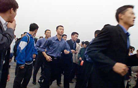 早上8:15分,一外地農村中年婦女(估計是大法弟子)被抓,國旗周圍的大法弟子開始打橫幅,在廣場上的眾多警察和便衣通過步話機聯繫,集結衝向這些大法弟子,這時國旗周圍出現了好幾組打橫幅並高喊「法輪大法好」的大法弟子,每組約20多人,學員們緊抓橫幅,大約持續了10分鐘,警方迅速用中巴把大法弟子帶走,僅我目擊有10多輛,共計200-300人。