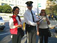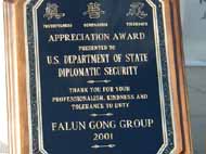 今天活動臨近結束的時候,學員們為了感謝DC警察們對大法及大法活動的支持,特意向他們贈送了感謝卡和一個木刻的、上書中英文「真善忍」等字的精緻獎牌。警察局主管非常高興和滿意。警察們發自內心地說:「從未見過你們這麼好的抗議請願隊伍。」