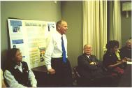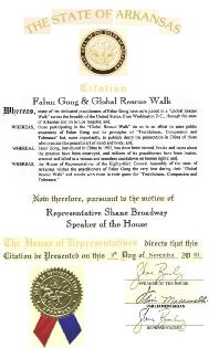 百老匯先生代表阿肯色州眾議院向學員們頒發了支持法輪大法和全球緊急救援活動的聲明書(citation)。聲明書中寫到:「法輪功從1992開始公開傳播,目前在中國被禁止,法輪功的書籍和音像製品被銷毀,數以百萬計的法輪功修煉者被打、被抓,甚至在如此失去理智的殘酷人權迫害中被迫害致死。」他還建議學員們再與其他政府官員尤其是州秘書長(與長春姐妹城的發起人)聯繫,並介紹法輪功受迫害的真相。最後學員們為百老匯先生播放了大法弟子在中國遭受到殘酷迫害的錄像。