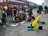 不一會兒,我們已經被人們團團圍住,人們好奇地紛紛拿資料,讀了起來。有一個女孩,她指著 SOS傳單上趙明的照片問道:「他現在還在監獄裏嗎?」我不禁為她看似偶然卻並不偶然的問題心中一震。她得到了肯定的答覆。我們告訴她,現在整個歐洲,有許多善良的人們,在為了解救趙明,這位善良而堅定的修煉者,而奔走呼籲。接著,人們開始自動傳遞徵簽本,一個一個地簽名。無需多解釋,無需講甚麼,人們敞開真誠的心扉是最容易與「真,善,忍」溝通的。這是我感到最輕鬆的一次洪法了,我們仍然在繼續煉功,可是簽名卻以飛快的速度進行著。雖然我們只帶了一本徵簽本,在短短的一個半小時中,簽名的人數是140多,不到一分鐘一個!這個速度在我們以後的幾天街頭洪法時,從來沒有掉下來過,無論是天氣好時,還是氣候比較寒冷時。