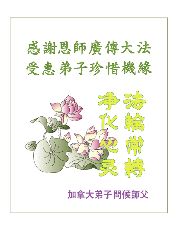 大法弟子:陳 際、王淑清、王純玲、王志和、王俊香、仇豔如、朱義、朱豔澤、宮志娜、陳淑珍、劉玉真、趙玉傑、宮長春、朱穗禾、陳東、康光春、王玉珍、朱英敏、鐘麗華、馮玉秋、張雲英、徐鳳芹、高鳳蘭、王紅海、唐秀芬、張永祥、姜桂榮、周桂新、宮秀英、楊中林、劉景樸、姜紅軍、王玉芹、張桂榮、蘇桂清、朱志麗、楊國權、楊喜文、李玉珍、李淑華、於文賢、尹淑芝、周振傑、張淑芝、張希華、董潤珍、王立君、蘇 頤 2001年5月8日