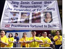 大赦國際2001年報告說,被禁止的法輪功精神運動的追隨者們面臨嚴厲的鎮壓,據報導至少93名追隨者已死在警察局的拘留所,許多是在被施酷刑後死亡的。2000年年底,數千,也許甚至是數萬修煉者在拘押中。許多人沒通過審判就被判「勞教」。