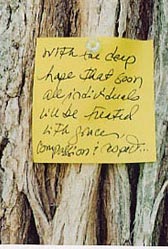 我開始感到高興,因為我能坐在這裏。但我又多麼希望能作為一個見證人,手捧一位被迫害致死的弟子的像片啊!但我馬上想到:「可別那麼執著,誰捧都一樣。」就這樣,我放下了這一執著。當結束時,我們站起來,一位同修要我把她捧的像片送回去,因為她正在找人。突然,我有五分鐘時間可以手捧死難同修的像片了。這是我第二次感受到的慈悲。