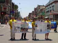 【明慧網2001年6月25日】每天早晨,位於多倫多大學附近的一條林蔭小道上,總能見到一群精神飽滿,安靜祥和的人,他們三三兩兩地向一個桔紅色建築物走去,建築物的國徽顯示這是中國駐多倫多領事館。到領館後,他們有的掛橫幅,有的放展板,有的發報紙,其餘的靜靜地排好隊。這群人看起來有高度的組織紀律性,但卻找不到任何組織者。旁邊的橫幅、展板告訴路人原來這是一群法輪大法學員。