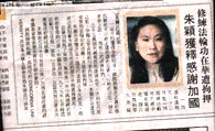 【明慧網2001年6月25日】世界日報6月24日引加通社滿地可電,滿地可華裔居民朱穎(譯音 Zhu Ying)昨天在記者會上表示,感謝加拿大政府和人民幫助她脫離苦海。朱穎因隨身攜帶遭禁的法輪功書籍,於今年五月在中國大陸被當地警方逮捕。