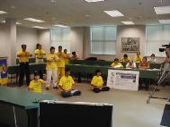 他們雙盤坐下,同時將右手平舉至胸前保持不動,約10分鐘。使用電池的錄音機裏面傳出輕柔的冥想型音樂以及平穩的聲調。「在中國有七千多萬人修煉法輪功」。
