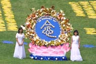 接下來的是被江澤民集團迫害的受害者及受害者家屬,雄渾悲壯的音樂中他們淚落如雨。在他們的身後是一個巨大的花圈,兩旁由兩名身著白色長裙的台灣學員護送,9排身著白色長裙的女學員,手捧著死難學員的像片,神情肅穆,後面是一個巨大的「255名法輪功學員被迫害致死」的橫幅。