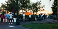 7月21日傍晚,我們在市中心河邊公園煉功及燭光守夜,紀念為護法、正法而失去人的生命的大法弟子。傍晚時分人來人往,許多人都過來看我們的展板,拿資料,在學員們受到殘酷迫害的照片前駐足良久。還有的人當場拿出錢來要幫助我們。當我們告訴她不接受捐款時,她祝所有像我們一樣善良的人們好運。但當晚的活動也受到邪惡的騷擾,一位騎自行車的白人公開表示不相信真、善、忍,支持中國政府,然後騎車匆匆離去。 另外還有兩位中國人來到我們的煉功場,當時我們正在抱輪,他們仔細打量每個煉功的中國人,看周圍沒有人注意,拿起相機要拍照,在旁邊照看小孩的學員看到後快步走過來,先給他們照了一張,於是他們慌慌張張的趕緊溜走了,一邊走還一邊不時地回頭看。這也更使我們認識到邪惡的猖狂,今後我們也一定要更努力地去洪法,從而窒息邪惡。