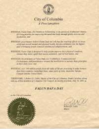 【明慧網2001年7月5日】南卡羅來那州哥倫比亞市宣布2001年7月10日為「法輪大法日」
