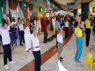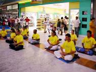 明慧學校的孩子們穿著整齊的白色煉功服,他們要到舞台上做功法表演。當他們排著隊在廣場上煉功時,吸引了許多公眾的目光。其中一小男孩還站在隊列前方,跟著明慧學校的孩子們煉了一遍。動作標準,非常認真。他的神態就像在告訴人們法輪大法對他來說是多麼的重要。