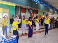 僑領洪先生一大早就來到了活動現場,他是「法輪功之友」的發起人之一。他被現場的氣氛所感染,即興寫了一首歌詞,並和法輪功學員、原瀋陽軍區歌舞團女高音獨唱演員白雪到舞台上演唱了這首歌。