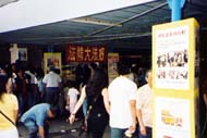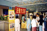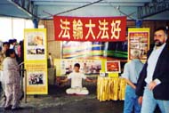我們在領館對面的柵欄上掛著用中意兩種文字寫的「法輪大法好」,「真善忍」,「停止虐殺」等橫幅,大法洪傳世界的照片和迫害照片,非常醒目,在馬路上行駛的車輛從很遠處便可望見。眾多的意大利人和華人路過,駐足觀看,索取真相資料。許多意大利人想學習功法,索取教功錄像和大法音樂。有住在小區的居民來學動作,有執勤的警察決定煉功,有人被大法音樂吸引來看個究竟,還有人看了傳單後到書店去購買意大利文的《法輪功》書並拿來告訴學員。還有一位意大利醫生,看過我們的照片後,一直不願意離開,通過交談得知他非常喜歡中國傳統文化,他也要學功了。洪法結束時他還幫助學員收拾橫幅和掛圖,並善意的要用自己的汽車送學員回家。