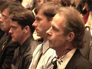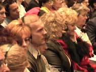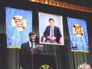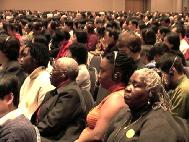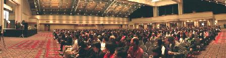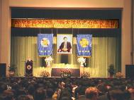 【明慧網二零零二年十二月一日】2002年11月30日,在美國賓夕法尼亞州費城臨近唐人街的賓州會議中心(Pennsylvania Convention Center)舉行了「2002年美東地區法輪大法修煉心得交流會」。美國東部的大法弟子,和來自美國其它地區及世界各地的兩千名法輪功學員參加了這次盛會。下午兩點多,師父親臨會場講法。在全場學員的熱烈掌聲中,師父以兩句膾炙人口的唐詩「兩岸猿聲啼不住,輕舟已過萬重山」為開場白,告訴眾弟子「迫害三年多了,邪惡已經使絕了招,大法弟子已經考驗成熟了」,並給大法弟子們講法約40分鐘。