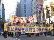 【明慧網2002年12月2日】2002年12月1日下午,部份參加2002年美東法輪大法修煉心得交流會的法輪功學員在賓州費城召開了新聞發布會,揭露中國大陸江澤民政治流氓集團對法輪功學員的迫害並呼籲幫助救援大陸學員。會後學員們舉著巨型橫幅在市中心舉行了大遊行。一些橫幅上寫著:「營救我們在中國的親人」、「法輪大法好」,遊行隊伍前面的「真善忍」大字非常醒目。