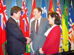 支持法輪功的大陸人士林慎立(左),在大陸被送勞改,經加拿大國會議員芤特爾 ( 中 )支援,獲得自由,飛抵加國,二十六日(當地時間)到國會山莊當面向芤特爾道謝,右為林慎立太太李進宇。