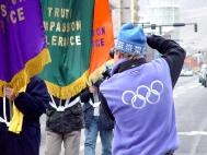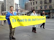 步行的隊伍成兩縱隊,在紛擾擁擠的市區緩緩前進,只有「普度、濟世」的音樂一路相伴。領隊的兩位學員手舉「法輪大法」的橫幅,這是整個隊伍中最醒目的了。部份學員在街道兩側發大法資料,其他的人則手持印有「真善忍」的黃色三角旗。小旗兒在風中的飄動,恰似一隻隻飛舞的黃色彩蝶,努力地妝點灰色的天空。在路旁的老婆婆看到了竟也想跟著走,但她低頭看看自己的衣裳,再看看學員清一色的黃色運動服,她靦腆地笑一笑,揮手道祝福。