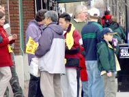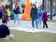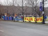 我想人都有明白的那一面吧。就像這次步行中,那兩個小學低年級的小朋友,他們也許不知道甚麼是中子、原子,哪裏是歐洲、美洲,但他們修的不一定比大人差: 他們煉起功來有模有樣,在這個淘氣、好動的年紀,他們打坐可以坐四十幾分鐘。我走著走著,眼眶竟微濕,卻說不出來究竟為了甚麼。我想起去年七月在華盛頓DC的全球緊急救援遊行中的情景。當時我在隊伍最後面發著傳單,發著發著突然心頭一酸,我想到師父、想到大陸學員,也想到了自己,頓時淚如泉湧。我趕緊跑到人行道的樹旁,手足無措地趕忙將眼淚擦乾。這種心底的感動至今難忘。