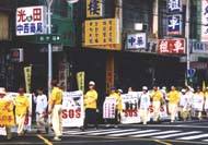 二十三日上午在鳳山地區舉行的SOS緊急廣救援步行活動,上午九時從大東國小出發,共有一百餘位法輪大法學員自發地參加。他們身穿鮮明醒目的印有法輪大法字樣的衣服,手拿說明真相的布條及看板,理性和平地走遍鳳山地區的大街小巷,受到沿途民眾熱烈迴響。步行隊伍在普度濟世慈悲祥和的音樂聲中,極有秩序地緩緩前行,隊伍中年齡最小的只有幾個月大,由媽媽推著車子往前去,年齡最大的阿公阿媽也精神抖擻地走完全程。在隊伍兩旁,則有許多法輪大法學員沿路散發大法簡介並徵集民眾支援,讓世人都能了解江澤民犯罪集團醜陋的真面目與流氓般的卑劣行徑。活動於上午十一時圓滿結束。