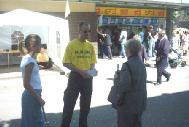 這天,發生了許多生動的事。一對老年夫婦來到我們前面。老太太說:「看完你們在藝術館裏舉辦的蓮花展後,我老伴兒一直就不停地念叨法輪功。我告訴他我不太相信這種看不見摸不著的事。然而,今天我來到這裏的感受,使我覺得我得重新評價法輪功了。」