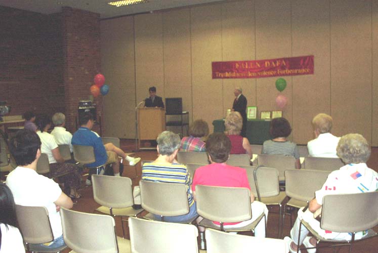 慶典儀式於下午兩點鐘開始。首先,法輪功學員致開幕詞,扼要介紹了自宣布首屆曼茂斯縣「法輪大法週」以來所引起的社會廣泛反響和支持,並向十多位曼茂斯縣的國會議員、州參眾兩院議員、曼茂斯縣縣政會,以及曼茂斯縣所屬城市的市長和市議會對法輪大法的一貫支持表示衷心的感謝。法輪功學員特別感謝來自曼茂斯縣的國會議員浩特先生和伯隆先生對中國大陸受迫害的法輪功學員人權的一貫支持和幫助。