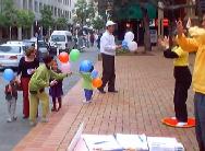 大部份學員們穿著有「法輪大法」、「真善忍」字樣的白色上衣和白色褲子,不斷地在廣場中心演示五套功法,有三個學員在隊伍前面的三個很大的蓮花座墊上煉功,路人紛紛取要大法資料,駐足觀看,學員們也不斷地向行人介紹功法和講清迫害真相。