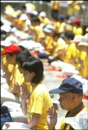 【明慧網2002年7月4日】2002年7月3日,來自十一個國家及地區的一百多名法輪功學員三日在香港中環遮打花園練功,抗議中共鎮壓法輪功。中央社記者盧健輝香港傳真