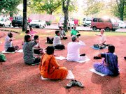 中央社圖片報導:7月3日法輪功學員在香港中環遮打花園練功
