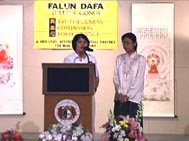 之後兩位澳洲學員談到了這次香港之行中過心性關的考驗。一位女學員的經歷體證了「關關都得闖」的法理:當她把一顆心放下,一關剛過,另一關又上來,關關觸動她的心。來香港之前,先生處處給她設置障礙。在經濟上,先生不給錢,她借錢來;工作上,先生說生意忙,她加班;先生說香港危險,不讓來,她的心全不動,先生反而轉變了態度,送機時還主動提出要還旅費給借錢的學員。先生的關剛過,入香港海關的關又來了,她悟到,在過關時,只要心時刻在法上,這關就能過。在飛機上,她時刻背誦師父經文《正神》。在面對香港入境關卡時,她腦子一片空白,只有「正神」。入境處人員就這樣一邊和別人講話,一邊給她護照上蓋了章。另一澳洲學員也談到了如何去除怕心的過程。