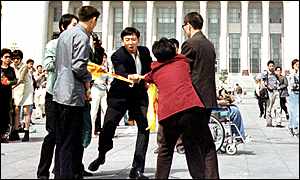 5) 許多西方法輪功學員包括美國公民去天安門合法和平請願遭到逮捕和野蠻毆打。