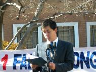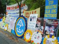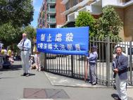 報導說由法輪功學員們發起的這項抗議在全世界各地展開,稍前,法輪功信息中心說自去年11月以來有43名學員被中國當局謀殺並公布了詳情。本地的法輪功學員安德裏婭-哈利宣讀了一份聲明,她呼籲江停止暴力鎮壓熱愛和平的人們。