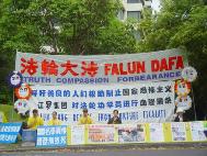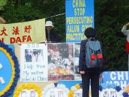 學員們的和平抗議活動引來不少路人的關注與支持,他們中有華人,日本人,西方人。他們有的說:「法輪功好!」 有的說:「保重。」還有人說:「謝謝。」 一對中年日本夫婦對學員說:「我們知道在中國不許煉法輪功,你們要保重啊。」一位來自上海的老先生說:「江XX就是壞。」