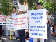 大約十名法輪功的支持者在西南第六大道的中領館前抗議,安靜地舉著橫幅,譴責前中共頭目江XX謀殺了數千名法輪功學員。