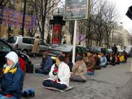 法輪功學員已經在中領館門口靜坐兩天了,他們抗議法輪功學員在中國受到的酷刑折磨。四位中國女子參加了今天的世界性的抗議江澤民的活動,這個中國共產黨首領於1999年把法輪功打坐功法定為非法。