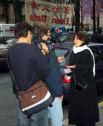 當記者在問及此次活動的目的時,法輪功學員王女士說:「我們今天在這裏就是與全世界的法輪功學員同步,開展為期三天的揭露江氏集團迫害法輪功進一步升級的活動。那麼在這裏我們想就江氏集團對法輪功的迫害向全社會揭露。」「今天我們來這裏,想傳達兩個重要的信息,一是制止中國江氏流氓集團對法輪功種類滅絕的迫害。二是呼籲全世界愛好和平的人們跟我們起來一道制止這種迫害的繼續。」