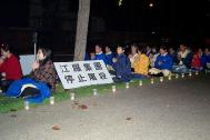 法輪功學員在中領館前打出橫幅,煉功請願,發正念並舉行燭光守夜活動。這次法輪功學員全球性的請願活動將持續到15日為止。這是放光明記者在日本大阪的報導。