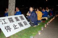 參加燭光悼念的人士中,有老人和小孩,以及曾在中國親身遭受迫害的法輪功學員。現年33歲的呂先生,1995年在喬治亞州立大學攻讀財經學位,後因不幸患上乙肝病,不得不中途輟學,修煉法輪功後,身體奇蹟般地得到恢復。回國後,呂先生曾在深圳市國家稅務局擔任稽查科副科長。2000年,在中國當局鎮壓法輪功的壓力下,呂先生被迫辭職,2000年11月,呂先生的新婚兩個月的妻子周雪菲因在街頭向公眾澄清法輪功真相,被當局逮捕,非法判處三年勞教監禁。呂先生說:「我的妻子周雪菲被關押已有一年多了。在中國像我妻子這樣的被迫害的人有千千萬萬,我們希望全世界的人來幫助這些無辜善良的民眾。芝加哥聯邦法院已受理了起訴江XX的案件,以‘滅絕種族罪’起訴江XX正是反映了我們千千萬萬煉法輪功人的心願。」
