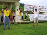 第二天早上,我們在一個著名的旅遊點煉功洪法,當地同修在附近掛滿了橫幅,擺放許多真象展板,因為那裏有來自中國的遊客,果然在我們煉功時,有許多中國遊客主動走來了解真象,他們做夢也想不到:小小的島嶼也有這麼多人煉法輪功!