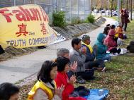 這次靜坐活動,雖然下著冰冷的雨,仍然聚集了近百名法輪功學員,法輪功學員舉行燭光夜禱,他們最大的願望就是中國政府早日停止迫害法輪功。攜幼子在風雨中參加此次活動的法輪功學員張女士表示:「看到中國大陸這麼功友受到殘酷的迫害,我們想要出來聲援,跟國內的學員比起來,我們受這些風雨根本不算甚麼。」