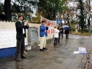 【明慧網2003年11月3日】為了促使中國政府停止迫害法輪功、為了挽救吉林監獄絕食的大法弟子的生命,慕尼黑大法弟子續10月30日的抗議活動後,於11月1日再次來到中領館前表達心聲:強烈要求立即釋放吉林監獄被關押的大法弟子,停止一切對法輪功的迫害。同時,再次向德國社會和民眾傳達我們的呼籲,希望大家都來關注江氏集團對法輪功的殘酷迫害,早日結束這場人類的巨大災難。