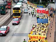 2月23日下午,來自世界各地的800多名法輪功學員在香港遊行請願,反對23條立法壓制人權,並抗議港府拒絕外地法輪功入境。