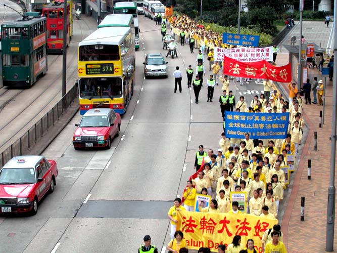 九面不同顏色寫有「真善忍」、「法輪大法」等字的直立幡旗,穿插在遊行隊伍中,份外顯眼,還有許多大小不一的橫幅,既有弘揚法輪大法,也有反對23條、呼籲制止迫害和緊急救援的。800多名各地法輪功修煉者,有些手拿展板,浩浩蕩蕩地從灣仔入境處大樓出發,遊行到政府總部。隊伍整齊而祥和,遊行人士沿途向路人派發傳單及向往來車輛微笑揮手,吸引了不少路人的關注和善意的回報。此次遊行是港府首次批准法輪功學員在大馬路上進行。