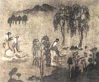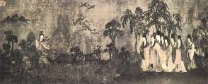 緊隨其後的六朝,一個蓬勃的繪畫藝術朝代又出現了。「自生人以來未有也」的顧愷之,工詩賦,擅冉法,他筆下的《女史箴圖》「氣韻生動」,境界超然。一幅《洛神圖》雖然描述了一段曹植與洛神之間的淒婉的愛情故事,卻不也蘊涵著人、神之間有著一種默契與溝通嗎?六朝的繪畫技法的頭一條「氣韻生動」道出畫家應以修身養性為主,才能使筆下的人物、山水、鳥獸,花草生機勃勃,意境深遠。「畫如其人」的說法大概就是從那個時候來的吧。我們再看這六朝的哪一個畫家不是深受道、儒學說的薰陶,並對佛教景仰甚至崇信的呢?精湛的六朝丹青繪畫藝術被其後的隋代畫家所承傳。閣樓宮觀、人物肖像和神話故事的巧妙結合散發著寧靜而安詳的精神氣息。展子虔的《遊春圖》畫面蘊涵著愉樂,悠然的氣息,遠處的山景、花草、樹木與近處的人物還有著互相襯托,互相默契的奇妙之處。