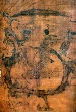 繼五彩之繪後,帛畫誕生了。最早的帛畫也就是絲布上的丹青。戰國出土的《人物御龍帛畫》描繪了一個高冠佩劍的男子駕馭一條疾馳的遊龍,畫面生動逼真,栩栩如生,觀賞者仿若置身於仙境。被絲帛神靈渲染得更加韻味深遠的書畫之邦春秋戰國漸漸隱退後,秦始皇統一了中國。這個對華夏歷史產生重大影響的朝代,不單單在軍事、政治上稱雄天下,在文化藝術、雕塑和建築上也稱得上雄風渾厚,綺麗而又威嚴。這個時期的丹青藝術主要表現在壁畫和極少量保存下來的木板畫、瓦當與畫像磚上。畫風雄健,色彩鮮麗,造型生動質樸表現出秦國一統天下時的精神氣魄。