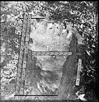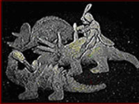 再看看另一塊石頭,上面雕刻的是一隻三角龍(Triceratops)。這種恐龍長得很像巨型的犀牛,以頭部的三支角得其名。圖裏雕刻的是一個人騎在三角龍的背上,手裏拿著像斧頭一樣的武器揮舞著。還有在另一塊石頭上,我們還看到一個人騎在翼龍背上。幾乎比較著名的恐龍類型在這些石頭雕刻裏都有出現,而且還似乎跟雕刻石頭上去的這些人的生活有密切關係。