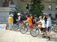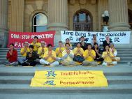 【明慧網2003年6月17日】6月14日,加拿大阿伯塔省法輪功學員為聲援「全球公審江澤民」,營救學員李祥春等活動在省立法大樓前舉行新聞發布會。來自埃德蒙頓和卡加利的學員參加了這次發布會。立法大廈前掛上了「全球審判江澤民」的橫幅,一幅幅展板展示著江氏政治流氓集團瘋狂迫害法輪功的罪證圖片,電視機裏滾動播放著有關訴江案的情況。