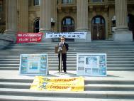 加州門羅.帕克市居民符泳青在昨天的一個集會上的發言使這個抽象的法律訴訟案件更為個人化。她對大約40名參加集會的人說,她的未婚夫李祥春因修煉法輪功已被中國政府關押了4個月。她說:「在中國根本就得不到公正,所以我們必須依靠美國司法系統來制止[江氏集團]對法輪功[學員]的酷刑折磨。」