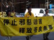 ◇一位路人問學員:「你們認識在中國遭受迫害的那些法輪功學員嗎?」學員說:「不認識,但是我把他們視為我的家人。在他們有難時,我應該去幫助。而且也是在維護人間正義。」那位路人聽後非常感動,說自己第一次看到這麼正直正義的人群。