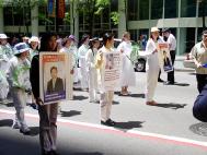 在遊行隊伍中人們可以看到一些巨大的橫幅。有的寫著:「法輪大法好」, 「請伸出援手支持法輪功」,「全球公審江澤民」等。透過這些看似平凡的字眼,關心法輪功的朋友們可以看到許多的內涵。