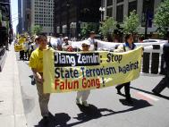 法輪功自從1992年從中國傳出,短短十一年傳到了世界上60多個國家。得到了上千個褒獎。可是由於中國的邪惡頭子江××出於嫉妒和膽怯,於1999年7月20日一手發動了對法輪功的殘酷鎮壓,採用了「名譽上搞臭,經濟上斷絕,肉體上消滅」的法西斯政策,直接造成了至少720名法輪功學員被殘酷迫害致死。法輪功學員在2002年10月以群體滅絕罪和酷刑罪等將它告上了美國法庭。今天法輪功學員們在這裏集會遊行的目的之一就是希望人們了解法輪大法,更清楚地認識江××的真面目,加入在道義法庭和人心法庭對血債累累的江澤民大公審。