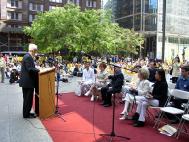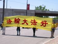 上午10點45分,新聞發布會開始,主持人宣讀了多封芝加哥市和伊利諾伊州政要發來的支持信和對美中法會的賀信。芝加哥市長Richard Daley在發來的賀信中高度評價了「真善忍」準則及法輪功為人類身心健康所作出的貢獻,並預祝法會圓滿成功。伊州國會參議員Richard Durbin,國會眾議員Lane Evans,國會眾議員Jan Schakowsky 也都送來對法會的賀信,並在信中表達了對法輪功學員信仰自由的支持和對這場殘酷迫害的強烈譴責。還有十數位芝加哥市市議員,伊州州參議員,州眾議員也發來賀信。伊州Peoria市市長宣布今年6月為該市的法輪大法月,Rock Island市宣布6月16日至22日為該市的法輪大法週。特別值得一提的是伊州Dixon市市長James Burke先生還專程與夫人驅車兩個多小時從Dixon 市趕來參加今天的活動,並發表了感人至深的講話,他手裏拿著《獨立宣言》說,「自由、平等、民主是美國的立國之本,信仰自由也是普世認可的基本人權,我為法輪功學員的自由而呼籲。」與伊利諾伊州相鄰的密蘇裏州的聖路易市市長,市議會議長,堪薩斯市市長,及幾位密州州眾議員也發來了祝賀法會的信件和決議案。密州國會眾議員Lacy Clay是簽署敦促法庭繼續訴江案的「法庭之友」信件中39位國會眾議員之一,他也特地發來信函來表達對這一歷史審判的強烈支持。
